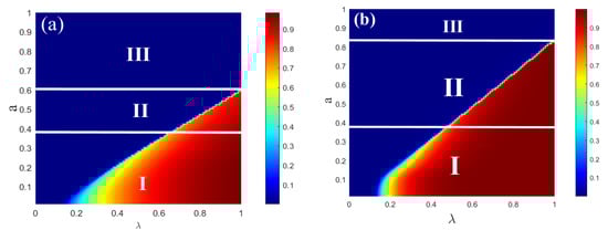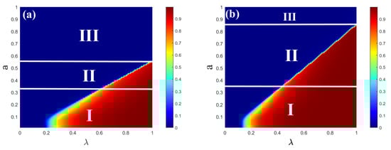 The combined roles of all passionate psychology parameter a and unit propagation probability on each individual’s eventual spreading size for a single-layer ER network. The impacts of subgraphs (a) () and (b) () on the final spreading scope are shown with the varying contact capacity of individuals. In subgraph (a), in region I, the growing exhibits a second-order continuous phase transition. In region II, however, the growing exhibits a first-order discontinuous phase transition. In region III, does not grow, indicating that there is no information outbreak in the region. In subgraph (b), in region I, the growing also exhibits a second-order continuous phase transition. In the same way, in region II, the growing exhibits a first-order discontinuous phase transition. In region III, does not grow, indicating that there is no information outbreak in the region. Other parameters are and = 1.0.