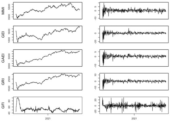 In the following section, four global indices (the S&P Global Resource Index (GRI), the S&P Global Agribusiness Equity Index (GAEI), the S&P300 Metals and Mining Index (MMI), and the S&P Global 1200 Energy Index (GEI)) and the fear/panic index (GFI) are analyzed. The first global index is the GRI, which comprises 90 companies listed in natural resources and raw materials. Investors can diversify their investments in three sectors: agribusiness, energy and metals, and mining. The second is the GAEI, which includes 24 of the largest agribusiness companies listed on the stock exchanges around the world; investment is diversified in terms of production companies, distributors and processors, and suppliers of equipment and materials. The third is the MMI index, made up of companies that are classified in the Global Industry Classification Standard (GICS®). It belongs to the metals and mining sector, which produces aluminum, gold, steel, precious metals, minerals and metals, and diversified minerals. The latest global index is the GEI, which comprises energy sector companies within GICS®. The series were obtained from https://www.refinitiv.com (accessed on 30 December 2022).