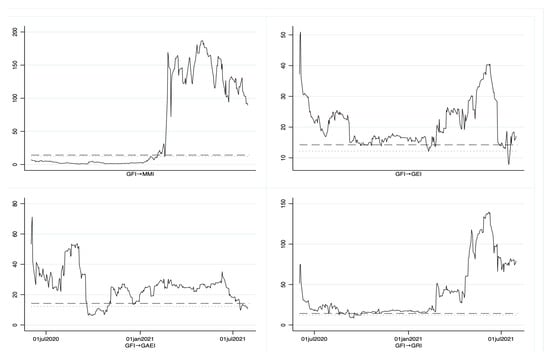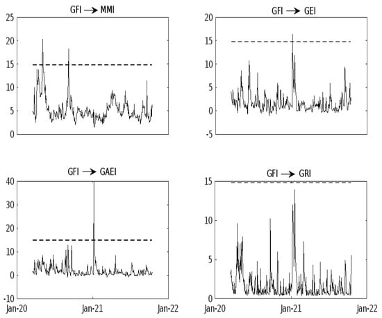 Figure 2 presents the points where the Granger causality occurs, and Table 2 shows the dates where the causality occurs. Observe now that GFI Granger causes MMI until the beginning of May 2021 in a unidirectional way. The same happens for GEI and GAEI, and there is no Granger causality for GRI. Over time, the market suffered periods of abnormal volatility due to the uncertainty generated by financial crises, political risks, or pandemics. Policies are required from governments to react in advance of the markets or to mitigate the impact to a certain extent, although the uncertainty generated by COVID-19 will continue to be present [43]. Figure 2 presents the results of . It can be observed that GFI Granger-causes MMI, GEI, and GAEI in a unidirectional way, except for GRI.
