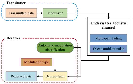 AMC is the intermediate process of signal detection and demodulation [2], occupying a very important position in signal processing technologies. Currently, most of the research on AMC focuses on radio signals (e.g., radar, cellular, satellite), and there is relatively little research on the classification of underwater communication signals. However, the demand for AMC in underwater acoustic communication is increasingly urgent with the development of modern communication technology. AMC of underwater acoustic communication signals is an important approach to the acquisition and analysis of target information in marine battlefields and has become a research hotspot [3]. The essential difference between underwater acoustic communication and radio communication is that the latter generally uses electromagnetic waves as the carrier, while the former uses sound waves generally because the conductivity of ocean water makes electromagnetic waves attenuate rapidly, especially at a higher frequency. Although sound wave is more suitable for underwater communication, it is still challenged by the poor underwater acoustic channel. The low velocity of soundwaves in water (about 1500 m/s) results in a significant delay in underwater communication (about 66 ms/km). Moreover, low velocity is one of the fundamental causes of the multi-path effect and Doppler shift [4], coupled with the extensive ocean ambient noise (OAN) [5], distorting the signals in both time and frequency domains, such as time delay-spread, frequency-selective fading, inter-symbol interference (ISI), frequency shift, etc. For all of these reasons, the AMC of underwater acoustic communication signals faces serious challenges.