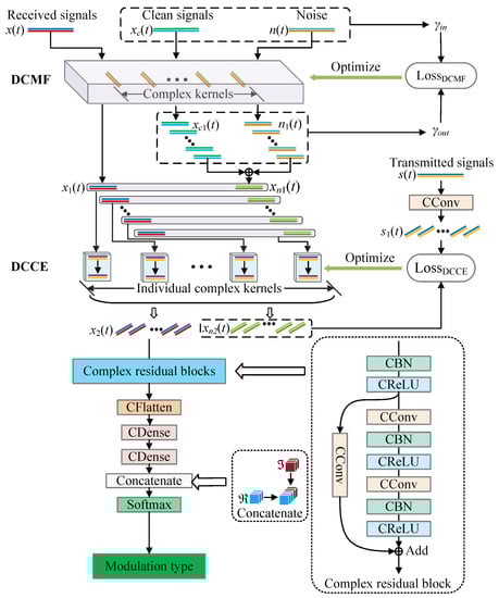 - Two physical signal processing layers were constructed based on DCN to improve the AMC performance, including a deep complex matched filter (DCMF) and deep complex channel equalizer (DCCE). The DCMF can help to remove noise from the signals, and the DCCE can reduce the influence of multi-path fading effectively. DCMF and DCCE were embedded in DCN to improve the AMC performance.