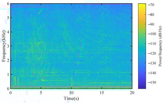 We built several underwater acoustic channels based on Ch1 and Ch2 using real-world OAN and AWGN as the additive noise, respectively, in which AWGN is used as a benchmark. The total duration of the noise is 6 h. Figure 5 has shown the spectrogram of one OAN sample.