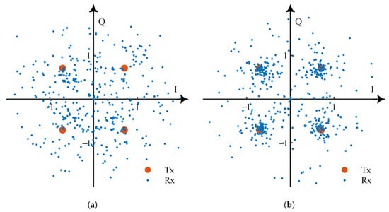 The influence of underwater acoustic channel on QPSK signal (where Tx is transmitted signal, Rx is received signal): (a) Influence of multi-path fading. (b) Influence of OAN (SNR = 0 dB).