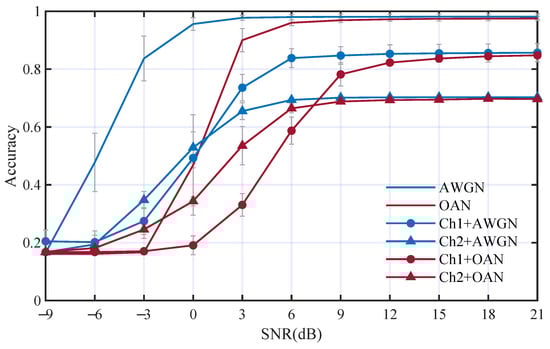 Similar results can be observed when using OAN as the additive noise, in which Ch1 and Ch2 reduce the by 17.6% and 18.9%, respectively. This illustrates that OAN has a greater influence on the AMC performance than AWGN, especially at low SNR. The multi-path fading effect can reduce the AMC performance significantly, even at high SNR.