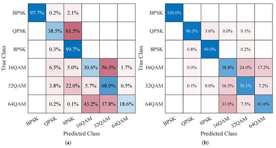 Confusion matrix charts on each modulation type in the underwater acoustic channel (Ch1+OAN): (a) SNR = 0 dB. (b) SNR = 9 dB.