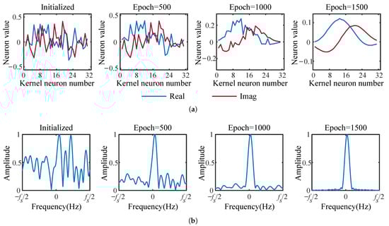 The transmitted signals are processed by an individual CConv layer. The number of kernels of this CConv layer is M, and the width of each kernel is 1. This CConv layer was designed to map several feature maps to match the dimension of , and the randomly initialized complex kernels can ensure that each feature map is not equal to another, including amplitude and phase. The output of this CConv layer is . The objective function is the mean square error (MSE) of and :