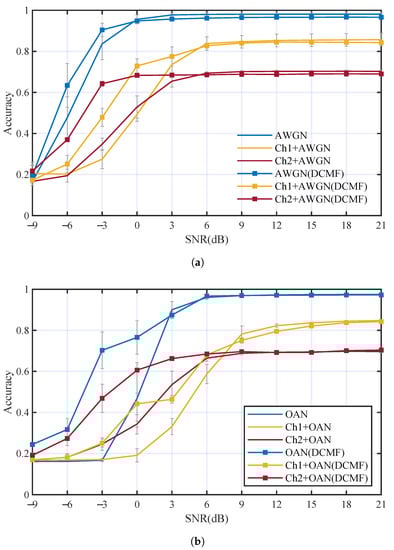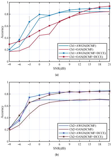 The influence of underwater acoustic channels on the performance of AMC was analyzed through a series of contrastive experiments, in which multi-path fading effect and additive noise were considered individually. We trained an ordinary DCN without DCMF and DCCE in this section as a benchmark for subsequent experiments. Figure 7 has shown the AMC performance comparison between different channels, which include AWGN channel, OAN channel (OAN), two channels include multi-path fading and AWGN (Ch1+AWGN, Ch2+AWGN), and two channels include multi-path fading and OAN (Ch1+OAN and Ch2+OAN). We can see from Figure 7: