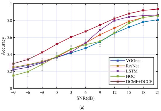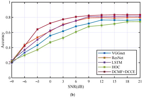The AMC performance comparison between the proposed method and some others achieved AMC methods were carried out. There were three AMC methods based on deep neural networks (include VGGnet [40], ResNet [41,42], LSTM [43,44]) and one AMC method using feature extraction based on HOC [45,46] (which is usually used for AMC of PSK and QAM signals) for comparison. The AMC method based on HOC used SVM as the classifier. The trainable parameters of VGGnet, ResNet, and LSTM were kept nearly to the DCN with DCMF and DCCE. The contrastive experiments were carried out with the two underwater acoustic channels (Ch1+OAN and Ch2+OAN), respectively. Table 4 and Figure 14 have illustrated the performance comparison in the two underwater acoustic channels of these mentioned AMC methods. In Figure 14a, of each AMC method is 50.78%, 54.94%, 55.95%, 51.48%, and 65.1%. In Figure 14b, of each AMC method is 59.95%, 65.79%, 65.82%, 55.17%, and 70.27%. The proposed method obtained higher classification accuracy than the other methods in the two underwater acoustic channels.