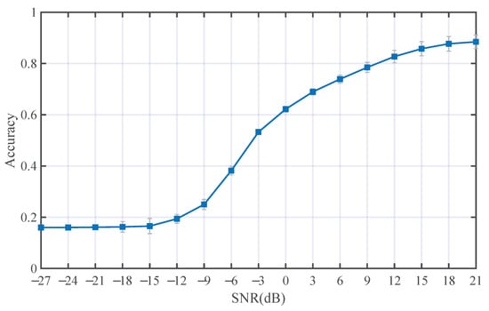 We considered six commonly used modulation types, including BPSK, QPSK, 8PSK, 16QAM, 32QAM, and 64QAM. The parameters for simulation are presented in Table 1. The SNR ranges from −9 dB to 21 dB with an interval of 3 dB. The received signals were expressed as the sampled complex baseband, the dimension of each signal sample is 6000 × 2, and the duration is 0.5 s. 10,000 signals are generated for each modulation type at each SNR, which contains 5000 training signals, 2000 validation signals, and 3000 testing signals, making a total of 330,000 training signals, 132,000 validation signals, and 198,000 testing signals.
