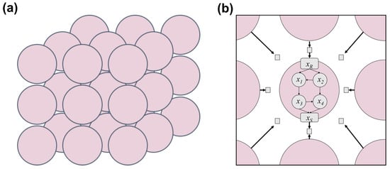 3D structured population of communicating cells. (a) The cellular population model consists of cells (pink circles) that are arranged in three dimensions on a lattice-structured grid. (b) Cells are described by internal networks and communicate with each other by secreting and sensing diffusible molecules (gray squares).
