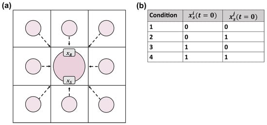 Experimental design for testing the asocial to social transition of cells. (a) a population of simple cells with only 2 nodes, and ; (b) the initial conditions for the simple 2-node experiment. is the initial state of cell i’s signaling node, and is the initial state of all other cells’ j signaling nodes.
