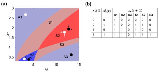(a) The six distinct signaling regions in the , space. Each region corresponds to a distinct signaling behavior of any cell i in a tissue sample with a given , value. In the asocial regions (blue), cell i’s receptor is always ON (A1—light blue), responds to self-signal (A2—dark blue), or is always OFF (A3—light blue). In the social regions (red), cell i’s receptor can be activated by self or neighbor signal (S1—light red), primarily neighbor signal (S2—dark red), or both self and neighbor signal (S3—light red). For easier visualization, only is shown. See Figure S1 for the wider parameter range used in simulations; (b) the value of cell i’s receptor at time , , in response to the four initial signaling conditions of cell i, , and all other cells j, , at time .
