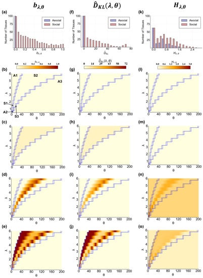 For heterogeneous tissue samples, we found that communication has a strong effect on tissue diversity. While the tissue samples in the asocial and social regions have a similar distribution of entropy values, social tissue samples exhibit more entropy values per tissue and a 60% increase in the maximum entropy as compared to asocial tissue samples (Figure 4k). Tissue entropy in social tissue samples take values that are higher, lower, and/or the same as in asocial regions, varying along , curves (Figure 4n,o).