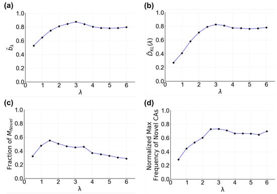 While missing CAs are missing from the entire social signaling parameter space, the expression of novel CAs is not evenly distributed across interaction distances and receptor threshold values. Some novel CAs are only observed at particular , values. We found that, on average, a cellular BN expresses the largest fraction of its novel CAs at (Figure 5c). Additionally, the maximum fraction of cells in a novel CA within a tissue sample increases with until (Figure 5d). Thus, a cell will have the highest chance of expressing a novel behavior and the largest number of possible novel behaviors, when communication is limited to the distance of one or two neighboring cells.