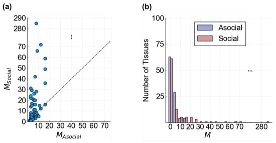 Numbers of cellular attractors observed in asocial (A1, A2, A3) and social (S1, S2, S3) regions of the parameter space. and are the number of unique CAs observed in the asocial and social regions, respectively. (a) vs. . Each tissue’s is directly plotted against its . The y-axis has been condensed (triple dots) to better visualize outlying data points. The diagonal line is plotted for reference (dashed line). It is rare that a tissue would have fewer attractors observed in social conditions as compared to asocial conditions (points below the diagonal); (b) histograms of and . The x-axis has been condensed (triple dots) to better visualize outlying data points. Social tissues exhibit a longer tailed distribution as compared to asocial tissues, with a maximum of over 10 times as many cellular behaviors.