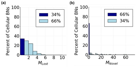 Likelihood of observing Lost or Novel CAs in tissues. (a) distribution of , the number of CAs lost by each tissue when communicating. In addition, 66% of cellular BNs lose at least one CA (light blue) and 34% do not lose any CAs (dark blue); (b) distribution of , the number of Novel CAs gained by each tissue when communicating. Furthermore, 34% of cellular BNs gain at least one CA (light blue) and 66% do not gain any CAs (dark blue).