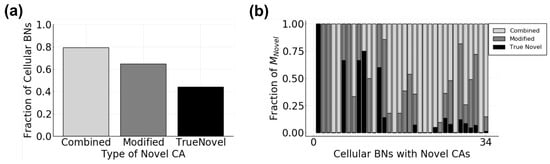 In order to understand how novel CAs can arise in cells in social tissue samples, we considered how they are related to other CAs. Per the definition of a cellular attractor, a CA consists of a set of cellular states. In the case of cells in asocial tissue samples, when cells are essentially closed systems, a cell state X will only occur once and will always have the same following cell state . Therefore, the CAs of cells within a particular asocial parameter region are composed of completely disjoint sets of states. When communication is introduced, cells become open systems, and the composition of their CAs is no longer constrained. Thus, it is possible that the novel CAs are variations of existing CAs. To obtain an idea of how CAs that arise in social tissue samples are related to those in asocial tissue samples, we used the set intersection between CAs to calculate the overlap between each novel CA and each asocial CA. Using this method, novel CAs can be classified into three broad categories: modified, combined, and true novel. A modified CA is one that has a non-empty set intersection with one (and only one) asocial CA with the addition of other cell states. These additional cell states are transient states in asocial cells that become stabilized in social cells. A combined CA is one that has a non-empty set intersection with more than one asocial CA with or without the addition of cell states. The final category, true novel, describes a CA that has an empty set intersection, i.e., no shared states, with all asocial CAs. These true novel CAs are composed entirely of states that were unstable transients in asocial cells. Notably, a cellular BN can have one, two, or all three types of novel CAs. Overall, we found that combined CAs are the most common category, being present in the highest fraction of tissues (Figure 8a) and usually the highest fraction of the novel CAs for any of one tissue (Figure 8b). Modified CAs are the next most common followed by true novel.