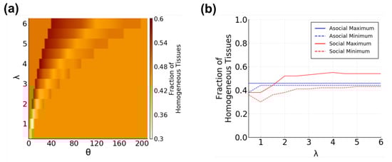 Fraction of tissue samples that are homogeneous as a function of and . (a) heatmap of fraction of homogeneous tissues as a function of and ; (b) maximum (solid) and minimum (dashed) fraction of homogeneous tissues at each value, split by asocial (blue) and social (red) regions. Both (near) global max and global min occur in social regions at .