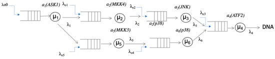 λi (0 ≤ i ≤ 6) represents the arrival rate of P from node ai. λoi denotes the arrival rate of P from the outside. The ladder-like mark symbolizes the queue of the signaling molecule. µi inside the circle represents the exchange (“service” in the queueing theory) rate in which P carried by ai−1 is transferred to another signaling molecule ai at the ith node. The arrow represents the orientation of irreversible signal transduction. The final node is DNA (binding histone proteins), where the transcriptional reaction occurs []. This is depicted in a figure, and schemes follow the same formatting. The symbol ai (Ai) above the µi represents that signal molecule Ai stays at the node.