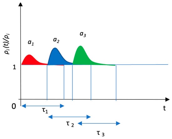 The vertical axis represents the ratio of the phosphorylated signaling molecule ai concentration (1 ≤ i ≤ 3) to that at the steady state, ai (t)/ai = ρi (t)/ρi, where ai represents the signaling molecule Aj-P concentration at the steady state. The horizontal axis indicates the duration, where τi (1 ≤ i ≤ 3) represents the phosphorylation period for each signaling molecule ai. In this case, the signal transduction proceeds in the order of 1→2→3.