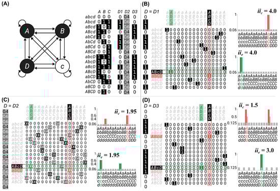 First, we considered a system of four interconnected, deterministic units, each with a unique input–output function (Figure 1A). The current state of the system was that units were ON, and unit was OFF (indicated by the black circles and upper-case labels vs. white circles with lower case labels). The system specified a unique cause–effect state (Figure 1B) and, as a result, had high intrinsic cause and effect information ().