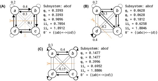 First, we considered a system of four units (denoted A, B, C, D) with a cycle of strong connections () and a reverse cycle of slightly weaker connections (), a weak self-loop (), and even weaker connections to non-neighboring units (). The connectivity structure was symmetric, and there were no fault lines in the system (see Figure 2A). For this system, there were two equivalent minimum partitions, either or , and the resulting integrated information was for both. For this system, the integrated cause and effect information were 48.1% of the intrinsic cause and effect information. Note that, in general, the proportions are not necessarily the same. However, for these examples they were the same because the state of the current state of the system was the same as the selected cause and effect states.