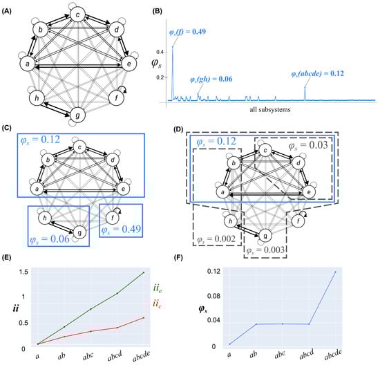 A universal substrate used to explore how degeneracy, determinism, and fault lines impacted how it condensed into non-overlapping complexes. (A) A universal substrate of 8 units, each having a sigmoidal activation function (Equation (2) (). Units has a moderate level of determinsism () and units had a low level of determinism (). A cluster of 5 units had stronger (but varying) connections within the cluster than without, a unit had a strong self-connection and weak connections with everything else, and two units were strongly connected between themselves with weak self-connections and weak connections to the rest of the units. (B) The system integrated information values for the potential systems . (C) The universal substrate condensed into three non-overlapping complexes, , , and , according to the algorithm in Appendix C. A solid blue line around a set of units indicates that it constituted a complex. (D) A sample of potential systems (dashed grey outline) that were excluded because they were a subset of a complex (), a superset of a complex (), or a “paraset”, partially overlapping a complex (). Each of these candidate systems had lower than . (E) The intrinsic cause and effect information of a nested sequence of candidate systems. (F) The integrated information of the systems in (E). The intrinsic information increased with each new unit added to the candidate system, but only when all five units were considered were there no fault lines in the system, leading to a maximum of integrated information.