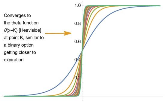 We note that the “smoothing” of the step function, or Heaviside theta produces a sigmoid (in a situation of a distribution or convoluted with a test function with compact support), such as , with , see Figure 3.