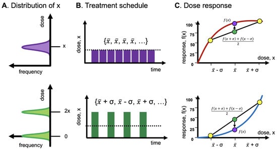 In medical practice, treatment protocols are typically fixed with doses administered at regular intervals (e.g., Figure 4). The distribution of dosing is unimodal (purple; continuous dosing), or, at most, bimodal (green; intermittent dosing). Manipulation of dose volatility when designing treatment protocols is under-utilized as a strategy in cancer treatment. In place of a dose x, one can give, say, 120% of x, then 80% of x, with a more favorable outcome if one is in a zone that benefits from unevenness. If antifragile, more unevenness is more beneficial: 140% followed by 60% produces better effects [].