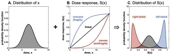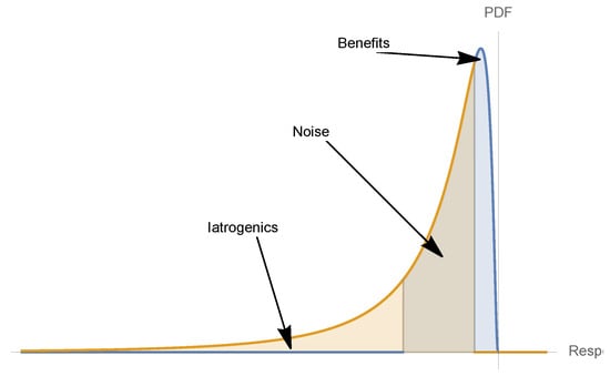 However, in spite of such simplicity, little work in medicine has been conducted about probabilistic effects on convexity—almost always limited to first-order effects and comparative statics. The probabilistic dimension of variability has been made explicitly in some medical domains, for instance, there are a few studies connecting Jensen’s inequality to patient responses with pulmonary ventilators: papers such as Brewster et al. (2005) [], Amato et al. [], Funk (2004) [], Arold et al. (2003) [], Graham et al. (2005) [], and Mutch et al. (2007). To summarize the literature, continuous high pressures have been shown to be harmful (leading to increased mortality), but episodic spikes of ventilation pressures can be helpful with the recruitment of collapsed alveoli (natural breathing exhibits some variability, with some breaths deeper than others). However, these papers stop at Jensen’s inequality, and, further, explicit probabilistic formulations are still missing in other domains where the applications of these techniques are most needed, such as intermittent fasting, episodic energy deficit, uneven distribution of sub-groups (say, proteins), vitamin absorption, moderate- and low-intensity training, fractional dosage, the comparative effects of low-intensity and distributed interventions vs. intense and concentrated ones, the chronic vs. the acute, and similar effects. As to the psychology literature, the notion of overcompensation is present Den Hartigh and Hill (2022) []. The identification of convexity is still confined to local responses and did not generalize to decision-making under uncertainty and inferences concerning silent risks from the nonlinearity in dose response. For instance, the results did not reach the obvious relation between tumor size and the trade-offs of the intervention, or the extrapolation between the numbers needed to treat (NNT) and the potential severity of the side effects.
