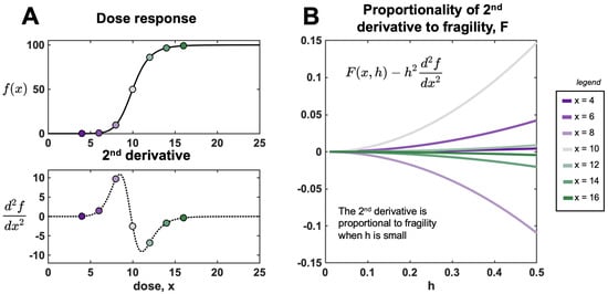 The second derivative is an approximation for fragility for low values of h. (A) Hill function, (Equation (11)) shown for , , , and . Analytically derived second derivative (Equation (12)) is shown in the bottom panel. (B) Difference between fragility and second derivative at various dose values (red to blue) corresponding to panel A. As , the error approaches zero: .