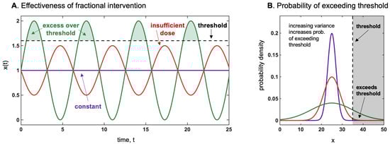 (A) How a fractional intervention is more effective to surpass a threshold than a constant dosage of the same average. This is akin to stochastic resonance (in physics), by which the presence of noise causes the signal to rise above the detection threshold. For instance, genetically modified BT crops produce a constant level of pesticide, which appears to be much less effective than occasional manual interventions to add doses to conventional plants. The same may apply to antibiotics, chemotherapy, and radiation therapy []. (B) How more variance impacts the exceedance over the threshold. If threshold ≥ mean, we have convexity, and the variance increases the payoff more than variations in the mean. Such an effect is proportional to the remoteness of such threshold. Note that the harm function is defined as positive.