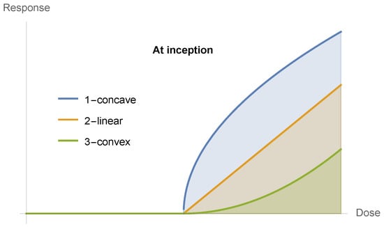 Now, all functions starting at zero will have three possible properties at inception, as in Figure 9 and Figure 10: concave, linear, and convex. The point of our discussion is the latter becoming sigmoid. Although few medical examples appear, under scrutiny, to belong to the first two cases, one cannot exclude them from analysis. We note that given that the inception of these curves is zero, no linear combination can be initially convex unless the curve is convex, which would not be the case if the start of the reaction is at a level different from zero.