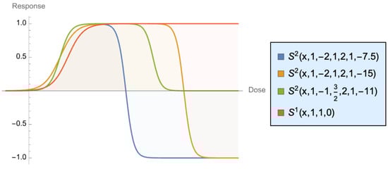 The shapes at different calibrations are shown in Figure 11, in which we combined different values of N = 2 and the standard sigmoid , with = 1, = 1, and = 0. As we can see, unlike the common sigmoid, the asymptotic response can be lower than the maximum, as our curves are not monotonically increasing. The sigmoid shows benefits increasing rapidly (the convex phase), then increasing at a slower and slower rate until saturation. Our more general case starts by increasing, but the reponse can actually be negative beyond the saturation phase, though in a convex manner. Harm slows down and becomes “flat” when something is totally broken.