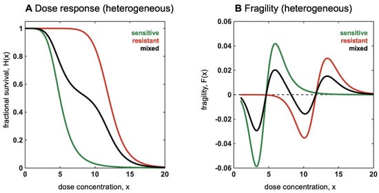 Thus, the important domain for convexity is the dose-dependent growth rate, . It is an unfortunate common practice to normalize dose–response curves to obtain fractional survival at the final time point (e.g., ), which obscures convexity. Drug-induced growth rate inhibition (GR curves) has been introduced as a method to remove the artifactual dependency of IC50 and Emax on the cellular division rate []. GR curves preserve convexity, unlike fractional survival.