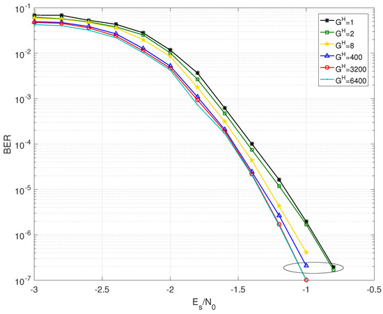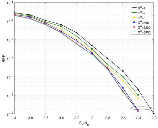 The BER performance of and with different grouping strategies are shown in Figure 2, Figure 3, Figure 4 and Figure 5. Firstly, it should be noted that the JGSSD algorithm is suitable for both the cases of and . Secondly, the BER performance in the water-fall region becomes better as the increases; this is in line with the EXIT analysis. It should be noted that the case of is equivalent to the SSSD algorithm in [7,8]. For the case of at source statistic at , the case of has a coding gain of 0.2 dB compared with the case of and has no significant difference compared with and at the BER of . Other comparisons can be seen in Table 4. Thirdly, the error floor level also becomes lower as the increases, and this is in line with the EXIT analysis. For the case of at source statistic at , the case of is better than that of , but worse than that of . It should be explained that the case and have almost the same error floor level as that of .