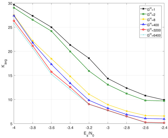 Without loss of generality, the case of at source statistic is taken to compare the decoding complexity and latency. The decoding complexity can be evaluated by the decoding iteration number. Thus, the average iteration number for different grouping strategies is shown in Figure 6. With increasing , the decreases, but the trend is getting smaller. The larger has a smaller than that of the smaller . For example, the cases of and respectively decrease by and compared with the case of at dB, as shown in Table 5.