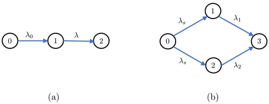 When or is zero, the parallelly-connected network reduces to a serially-connected network with a single path from node 0 to node 3. Thus, in this case, the stationary moments and variance of the age process at node 3 reduce to the corresponding expressions associated with the age process at node 2 in the serially-connected network such that and λ are replaced by and or . On the other hand, when and approach ∞, we have , , and . Note that the stationary moments and variance of reduce to the ones associated with .