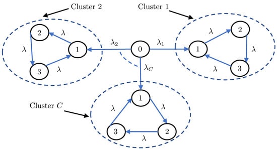 A clustered gossip network topology consisting of C clusters such that the status updating rate from node 0 to the c-th cluster is .