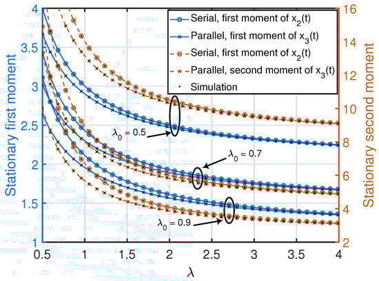 Stationary first and second moments of age processes in the serially and parallelly-connected network settings. We set and . The simulated curves are obtained from the numerical evaluation of the stationary marginal moments using (10) in Theorem 1.