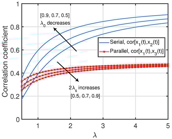 Due to the symmetry in the configuration of the parallelly-connected network, note that the correlation coefficient between and (i.e., ) can be obtained by replacing and with and , respectively, in (31). Furthermore, for a given , monotonically decreases as a function of from until it approaches . On the other hand, for a given , monotonically increases as a function of from until it approaches . Finally, for a given , one can deduce the following asymptotic results: and . Clearly, when , there will only be a single status-updating path from node 0 to node 3 (through node 1), and hence we observe that reduced to the same expression as in (19) for the serially-connected network after replacing and λ with and , respectively. Some of the above insights can also be seen in Figure 4.