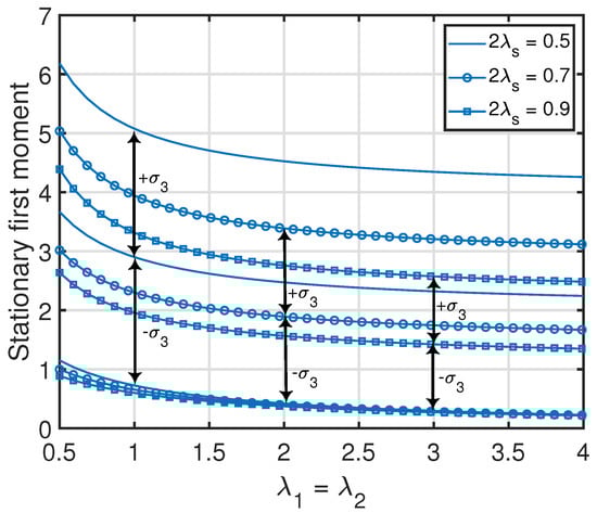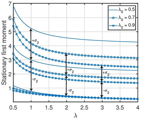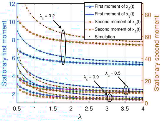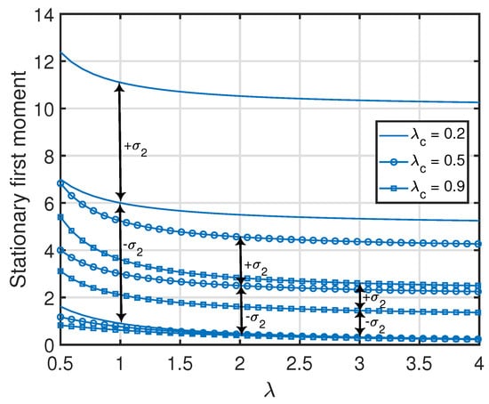 Note that the stationary moments and variance of the age process at node 2 in (18) are invariant to exchanging λ and . These quantities are also jointly convex functions in , where the minimum value (zero) of each function is achieved at . Furthermore, for a given λ or , each quantity in (18) is a monotonically non-increasing function with respect to or λ. This can also be observed in Figure 3.