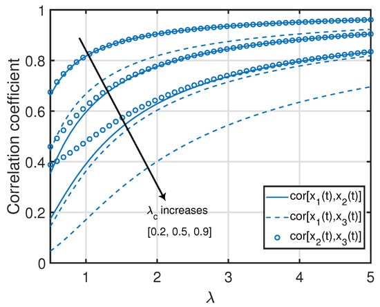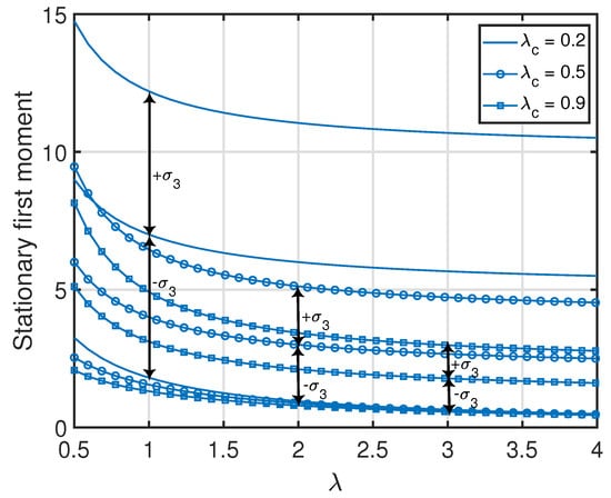 For a given λ, in (19) monotonically decreases as a function of in the form until it approaches . On the other hand, for a given , monotonically increases as a function of λ in the form until it approaches . This can also be observed in Figure 4.