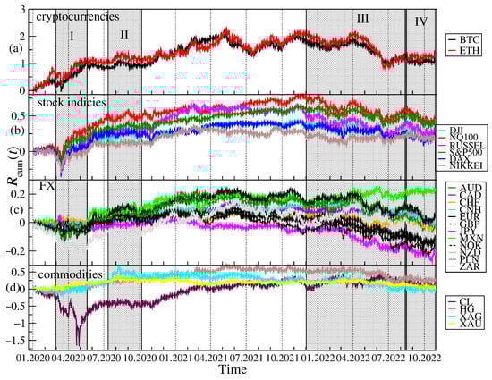 Evolution of the cumulative log-returns of the cryptocurrencies (a), the stock market indices (b), the fiat currencies (c), and the commodities (d) over a period from 1 January 2020 to 28 October 2022. Periods for which significant correlations between the cryptocurrencies and the US stock indices are distinguished by grey vertical strips. The most characteristic periods are denoted by Roman numerals: a COVID-19-related crash in March 2020 and a quick bounce in April–May 2020 (period I), new all-time highs of NQ100 and S&P500 and a September 2021 correction (period II), a bear phase in the cryptocurrency and stock markets since November 2021 (period III), and another downward wave of US stock indices after holiday upward correction along with the appreciating USD and inflation fears (period IV).