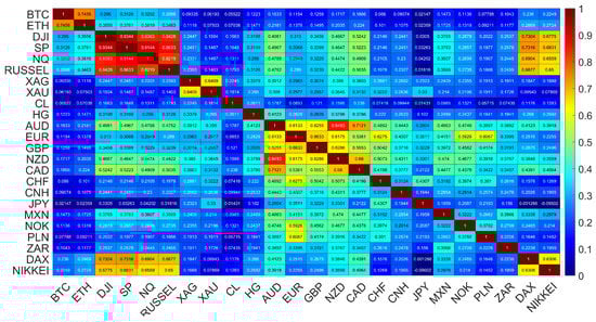 Cumulative log-returns of all the instruments considered are plotted in Figure 1 against time. The original price changes, sampled every , were transformed into logarithmic returns: , where is a price quote recorded at time () and i stands for a particular financial instrument. We use this particular time interval , because such a data set was available from the source. However, it is satisfactory because it allows us to avoid excessive null returns, which lower reliability of the detrended analysis (see below). In order to obtain the indicative relationships among all the time series, the Pearson correlation coefficient C [] was calculated for the log-returns from January to October 2022, when the joint bear market mentioned above was observed. A correlation matrix obtained for 24 financial instruments is shown in Figure 2. While the Pearson coefficient is one of the most widely applied measures of time series dependencies (and this is why we also exploited it in our study), the results obtained with it have to be taken with some reserve in our context. This is because the statistical tests that we carried out, i.e., the Jacque-Bera test for normality and the ARCH test for no heteroskedasticity, both rejected the respective null hypotheses with high confidence (p-value < 0.00001), which means that the data under study was both heavy-tailed and heteroskedastic. Obviously, such a result is not surprising, because fat tails of the return distributions and volatility clustering are well-known effects observed in the financial time series [,,]. Nevertheless, the very long time series that were analysed here and the statistical significance of the obtained results convinced us that the Pearson coefficient can still serve as an effective measure of the time series correlations even in such circumstances. Taking all this into account, a standard naming convention: small (), medium (), and large () correlation was used to describe the coefficient values. The strongest cross-correlations (large, ) can be seen for the stock indices, for BTC and ETH, for AUD, NZD and CAD, for XAU and XAG, and for EUR and GBP. If we consider the cross-correlations between BTC and the traditional instruments, the strongest ones can be seen for NQ100 and S&P500 (medium, ), DJI and RUSSEL (medium, ), DAX (small, ) and NIKKEI, (small ). The Pearson coefficient above 0.1 (small), is observed for BTC on the one side and HG, GBP and EUR, as well as the so-called commodity currencies: AUD, CAD, NZD, MXN, NOK, and ZAR, on the other side. The cross-correlations between ETH and the other instruments are even higher: (medium) for SP500 and NQ100, (medium) for DJI and RUSSEL, (medium) for DAX, and (small) for NIKKEI. The same is true for the cross-correlations between ETH and the commodity currencies: (small) for AUD, CAD, NZD, (small) for MXN, (small) for NOK, and (small) for ZAR. Among the commodities analyzed here, ETH is the most correlated with HG (, small). The statistical significance of the coefficient values presented in Figure 2 has been checked by calculating the range: , where denotes mean and denotes standard deviation of C, from 100 independent realisations of the shuffled time series. The statistically insignificant correlation region is very close to 0 (the third decimal place), all the presented values, except DAX vs. JPY, are thus significant.