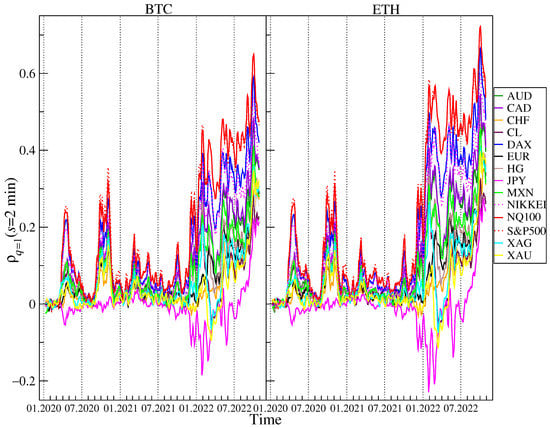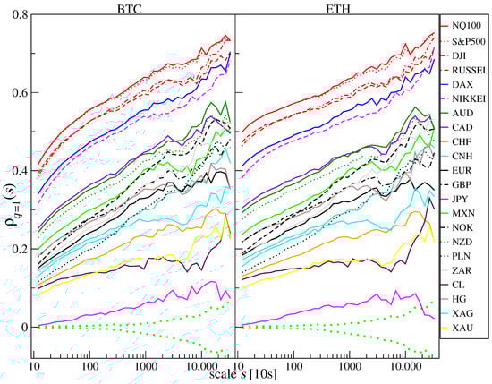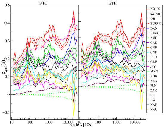 The aforementioned ability of to quantify cross-correlation for various time scales (s-dependence) and fluctuation size (q-dependence) is documented in Figure 3 and Figure 4, where the values of calculated for BTC and ETH versus the traditional instruments (the same as Figure 1) calculated for the log-returns from January to October 2022 is shown. One can immediately notice two properties: (i) the correlation strength increases with scale s for most financial instruments, and (2) the correlation strength is lower for (i.e., for large fluctuations Figure 4). These properties, observed here for BTC and ETH versus the other instruments, are typical for the financial markets in general [,].