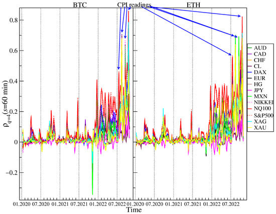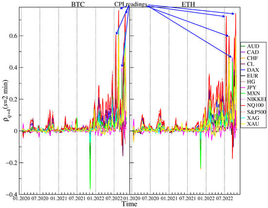 Evolution of the q-dependent detrended cross-correlation coefficient with and min calculated in a 5-day rolling window with a 1-day step between 1 January 2020 and 28 October 2022 for the price returns of BTC/USD (left) and ETH/USD (right) versus the selected traditional assets: AUD, CAD, CHF, CL, DAX, EUR, HG, JPY, MXN, NIKKEI, NQ100, S&P500, XAG, and XAU. Higher levels of cross-correlations, associated with the Consumer Price Index (CPI) readings, are marked (see the event description in Figure 9). The statistically insignificant correlations are in the region .