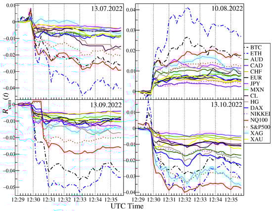 After careful checking of the exact start and end dates of the sliding window with increased correlations for and the time of large fluctuations, it turned out that the correlation of BTC and ETH with traditional financial instruments is (directly or indirectly via other markets) influenced by the CPI inflation data published every month at 12:30 UTC. Cumulative price changes in days during the CPI publication date 13 July 2022, 10 August 2022, 13 September 2022, 10 October 2022, from 12:29 to 12:35 are presented in the Figure 9. It can be clearly seen that in all four cases US tech stocks and cryptocurrencies price changes behave in the same way just after 12:30 UTC. It happened regardless of whether the surprise with the CPI data was positive or negative. In three cases, inflation data was higher than expected and surprised markets negatively, leading to declines. This is especially well visible in the case of 10 October 2022, when apart from US indices, XAG also follows the same trajectory. In the roling windows containing this day, the correlations were the strongest: 0.6 for S&P500, 0.79 for XAG and 0.86 for NQ100 vs. BTC and 0.6 for S&P500, 0.72 for XAG and 0.82 for NQ100 vs. ETH for min. In one case, 10 August 2022, the inflation was lower than expectations, which resulted in an increase in all instruments. This price behavior means that cryptocurrencies have started to respond to readings from the economy, just like traditional financial instruments. Despite the fact that our analysis of the cross-correlations was carried out by means of the measures, which were unable to detect the direction of influence, it seems natural to infer that these were the economical data releases that had direct or indirect impact on the cryptocurrency market rather than the opposite. That is why we concluded about the direction above.