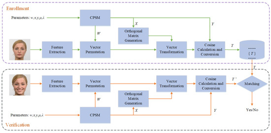 However, templates face many security threats. Some template protection schemes have been successfully cracked, due to insufficient security, which brings huge security risks to registered users [6,7]. Therefore, this paper aims to design a secure template protection scheme to ensure the information security of registered users. Chaotic systems with excellent performance are highly sensitive to initial values [8], and the generated chaotic sequences have good randomness, so they have been widely used in random number generators, image encryption, and other fields in recent years [9,10]. Applying chaotic systems to feature template protection is beneficial to improve security and make the generation process more convenient. The proposed scheme uses the chaotic sequence generated by the chaotic system to drive the generation process, ensuring that the scheme has good revocability and diversity. After vector permutation and vector transformation, the extracted face feature vector is calculated with a random matrix, and the calculation results are converted into integers to generate a template. This process ensures the irreversibility and performance preservation of the templates. The scheme has good security, which can ensure that the template will not disclose the original feature information of registered users and can prevent the malicious use of the template. Here, we list the novelty and main contributions of this paper: