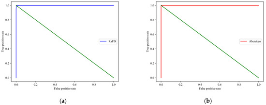 In order to verify the performance of the proposed scheme, 4000 pairs of images are randomly selected from each dataset. The images selected in each database include two images of 2000 pairs of the same person and two images of 2000 pairs of different people. For each pair of images, the corresponding templates are generated, and the cosine similarity is used to calculate the similarity of each pair of templates. According to the test results, we draw the receiver operating characteristic (ROC) curves, as shown in Figure 2. It can be seen that on the RaFD and Aberdeen datasets, the left part of each curve rises almost vertically to the top, and the upper region is very narrow, which means that the proposed scheme has good accuracy.